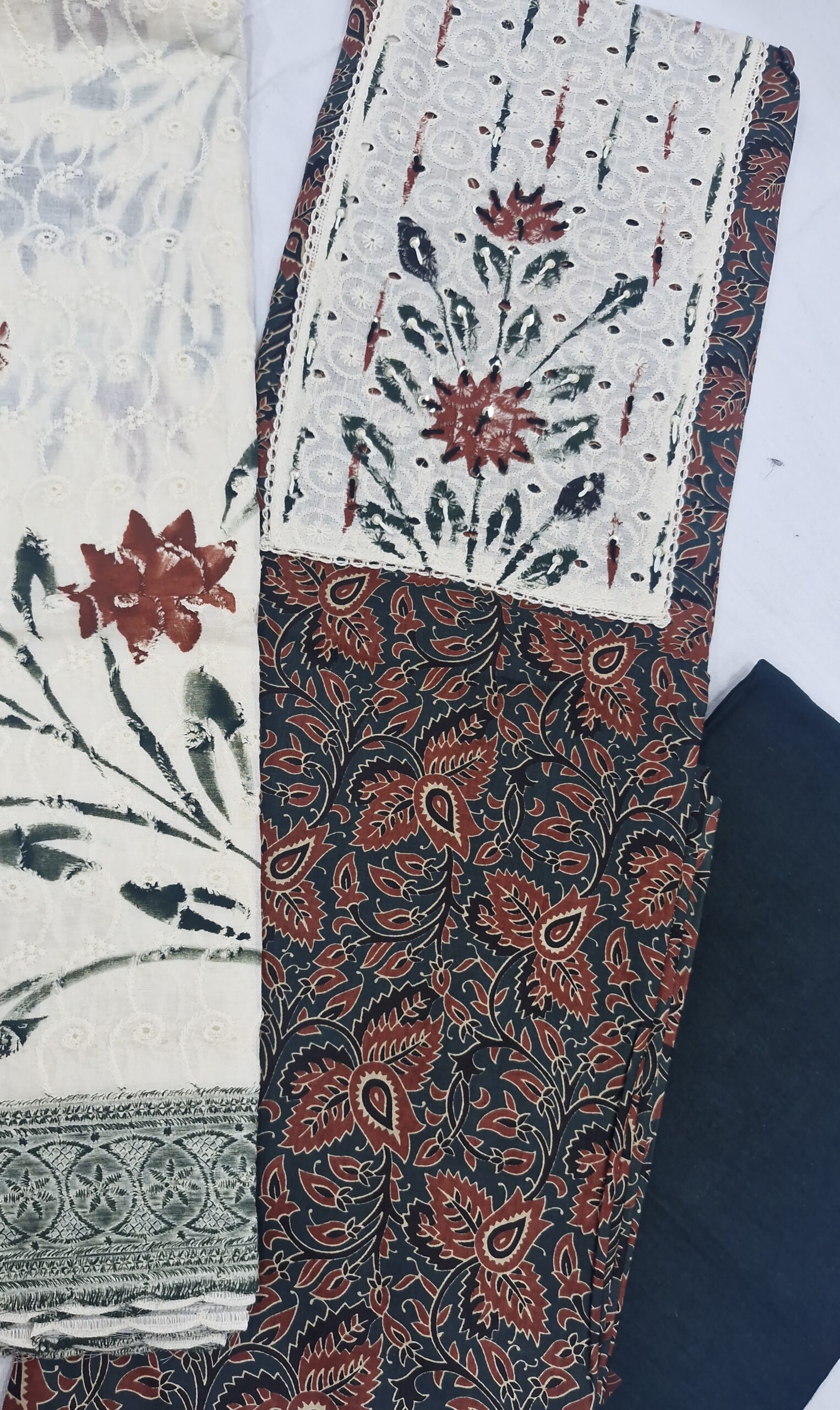 Elegant Ajrakh cotton salwar material with Aari work neck patch and hand brush printed dupatta. Soft, breathable cotton set perfect for daily wear and traditional look. ✨